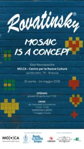 L’evento “Rovatinsky: Mosaic is a Concept” esplora il mosaico come linguaggio contemporaneo, fondendo pixel art, pattern modulari e riferimenti alla street art urbana. Le opere