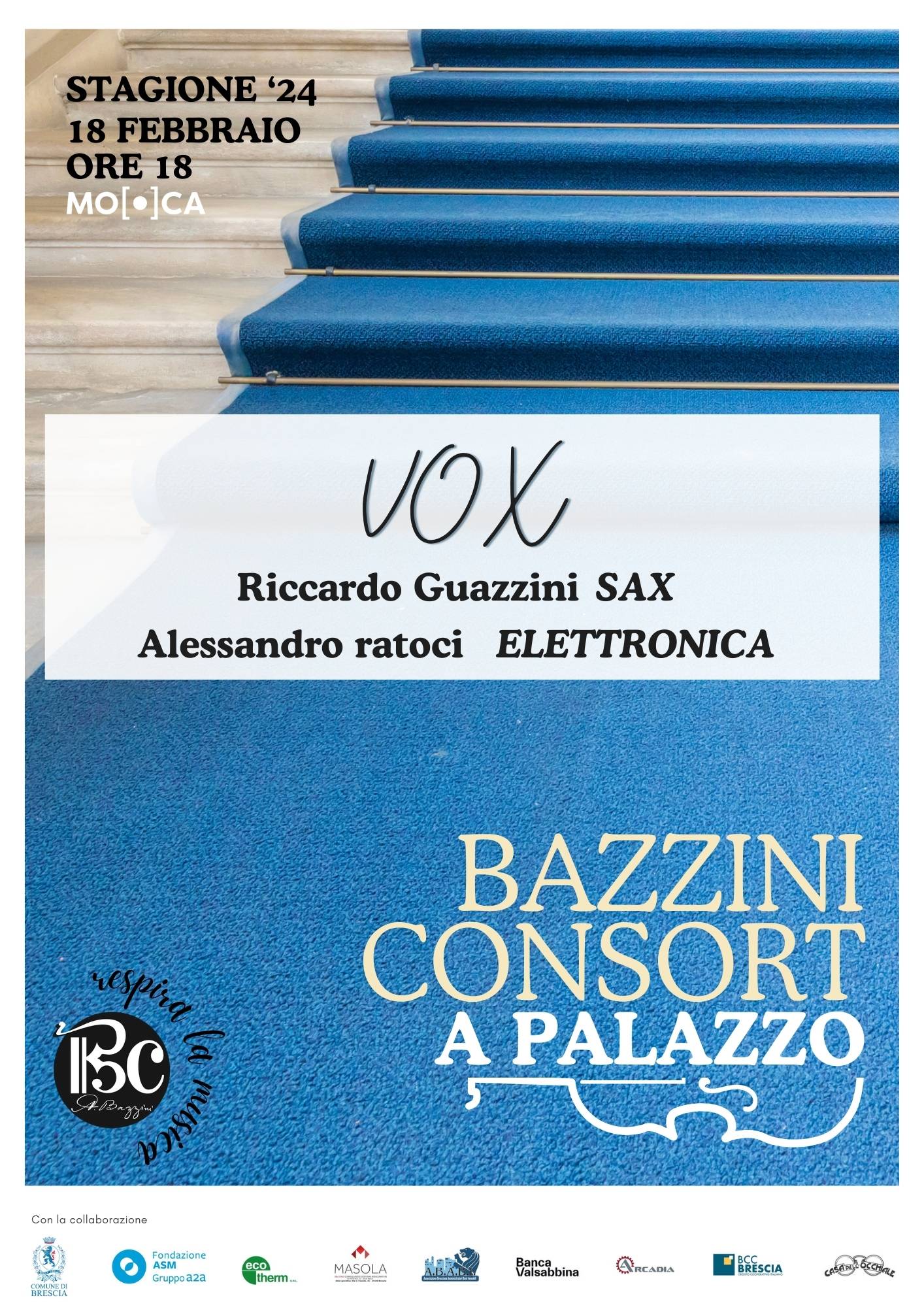 Riccardo Guazzini, SAX Alessandro Ratoci, ELETTRONICA Appuntamento a MO.CA con Bazzini Consort a Palazzo per un concerto unico sulle melodie per sax, con una punta di elettronica.