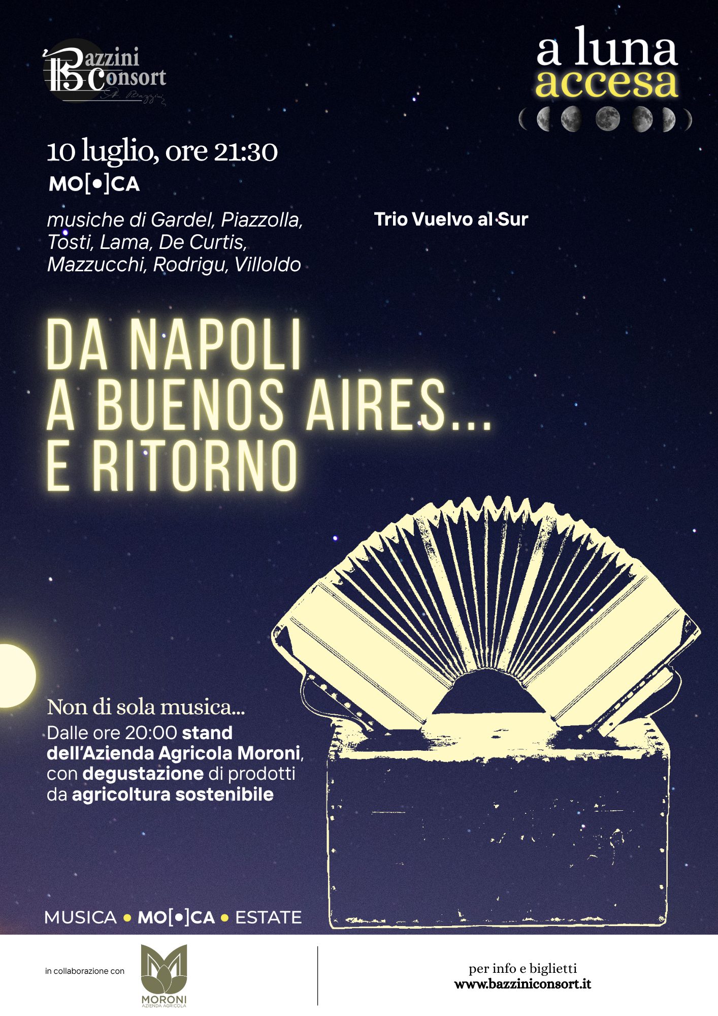 Un viaggio musicale che esplora il legame sorprendente tra le splendide melodie napoletane e i melanconici e sensuali tanghi argentini. Un trio di musicisti di formazione classica si addentra nelle radici e nelle affinità di queste due forme musicali amate in tutto il mondo, offrendo una prospettiva colta sulla ricchezza poetica e sentimentale della musica popolare, specchio di un’epoca e di un’umanità vibrante. Sul palco, il trio Vuelvo al Sur con la soprano Marianna Maresca, Gabriele Bellu al Violino e Francesco Furlanich alla fisarmonica.