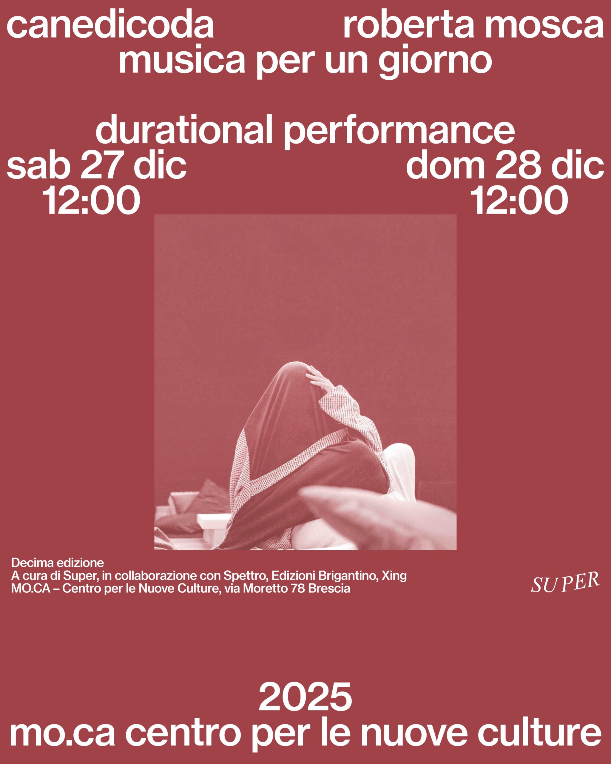 Sabato 27 dicembre 2025 dalle ore 12.00 sino a domenica 28 dicembre alle ore 12.00 a Brescia, Super, in collaborazione con Spettro, Edizioni Brigantino e Xing, presenta Musica per un giorno (Anno 10°), una non-stop performativa di Canedicoda e Roberta Mosca negli spazi di MO.CA – Centro per le Nuove Culture (Via Moretto 78): un’opera-rituale giunta alla decima iterazione di un lungo ciclo di 24 anni che si snoda per l’Italia in diversi luoghi e contesti.
