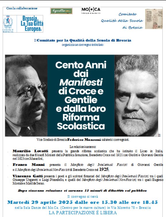 Nel 2025 ricorre il 100° anniversario di due importanti “Manifesti”, documenti filosofici e culturali scritti, pur se da opposte sponde politiche, dai più importanti filosofi italiani del XX secolo, e firmati da centinaia di altri intellettuali italiani, scienziati, poeti, romanzieri, storici, artisti, tra cui alcuni Premi Nobel. Quello degli Intellettuali Fascisti fu pubblicato il 21 Aprile 1925, Natale di Roma, quello degli Intellettuali Non-Fascisti fu pubblicato il 1 Maggio, Festa dei Lavoratori..