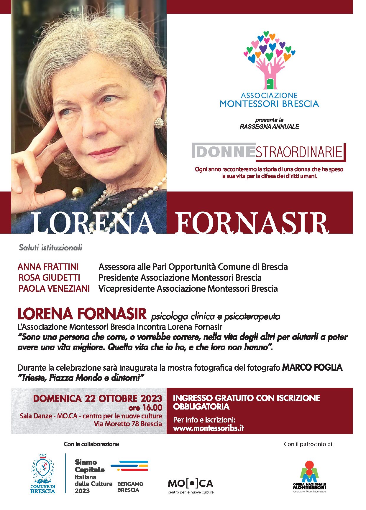 Rassegna annuale organizzata dall’Associazione Montessori Brescia, con il patrocinio del Comune di Brescia e dell’Opera Nazionale Montessori che, per il 2023, avrà come ospite e protagonista Lorena Fornasir, Psicologa e Psicoterapeuta che da anni nella Piazza della Stazione di Trieste, insieme a suo marito Gian Andrea Franchi e altri volontari, cura le ferite dei migranti che arrivano dalla rotta balcanica. Un lavoro generoso e coraggioso in aiuto a chi è in una situazione di particolare fragilità e non ha voce, un esempio di attivismo pacifico e silenzioso in difesa dei diritti umani. Un’altra preziosa testimonianza da condividere con chi vorrà partecipare a questo appuntamento. Presenzierà alla cerimonia l’Assessora alle Pari opportunità Anna Frattini. Al termine della Cerimonia verrà inaugurata la Mostra curata dal nostro fotografo ufficiale Marco Foglia “Trieste Piazza Mondo e dintorni”, un reportage fotografico realizzato nel Marzo del 2023 e che fa parte di un ampio lavoro di documentazione fotografica dei confini italiani. Il tema trattato è quello dell’emigrazione sulla rotta balcanica e della prima accoglienza in Italia.