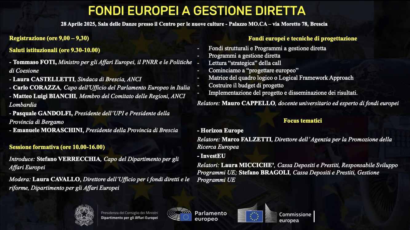 Il Dipartimento per gli Affari Europei organizza il seminario formativo “Fondi europei a gestione diretta” con l’obiettivo di promuovere una maggiore conoscenza e diffusione dei programmi europei a gestione diretta.