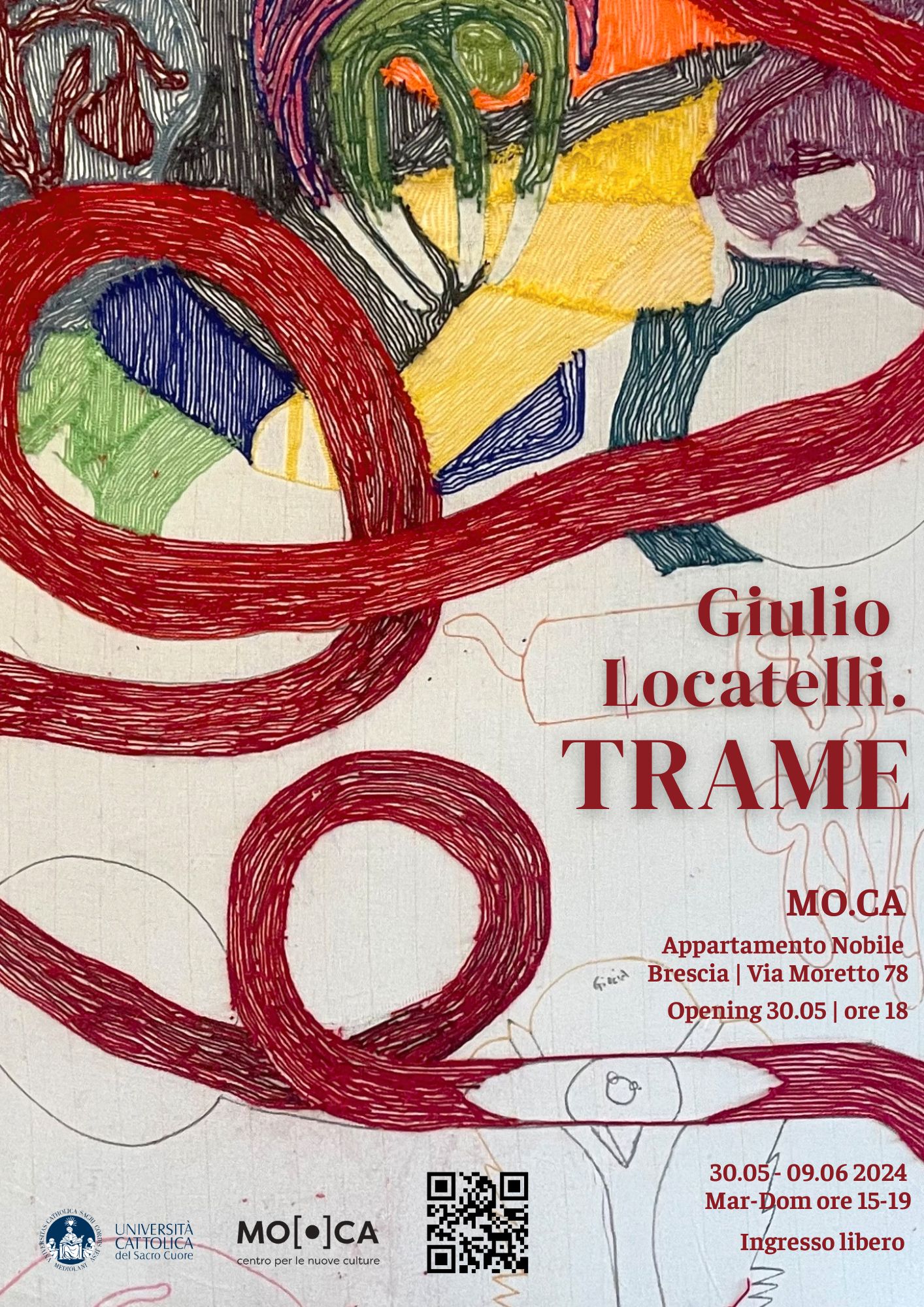 L’Università Cattolica del Sacro Cuore di Brescia presenta la mostra Giulio Locatelli. TRAME, ospitata nell’Appartamento Nobile del MO.CA – Centro per le nuove culture e curata dagli studenti e dalle studentesse del secondo anno del DAMS per le Arti, nel contesto del laboratorio L’evento d’arte (Alessia Bagossi, Erica Galli, Benedetta Gobbato, Gregoriy Podylov, Gianluca Ricca, Barbara Rota, Teresa Ruggiu, Federica Villa e Yuanfei Ye) coordinati dal Prof. Daniele Perra.