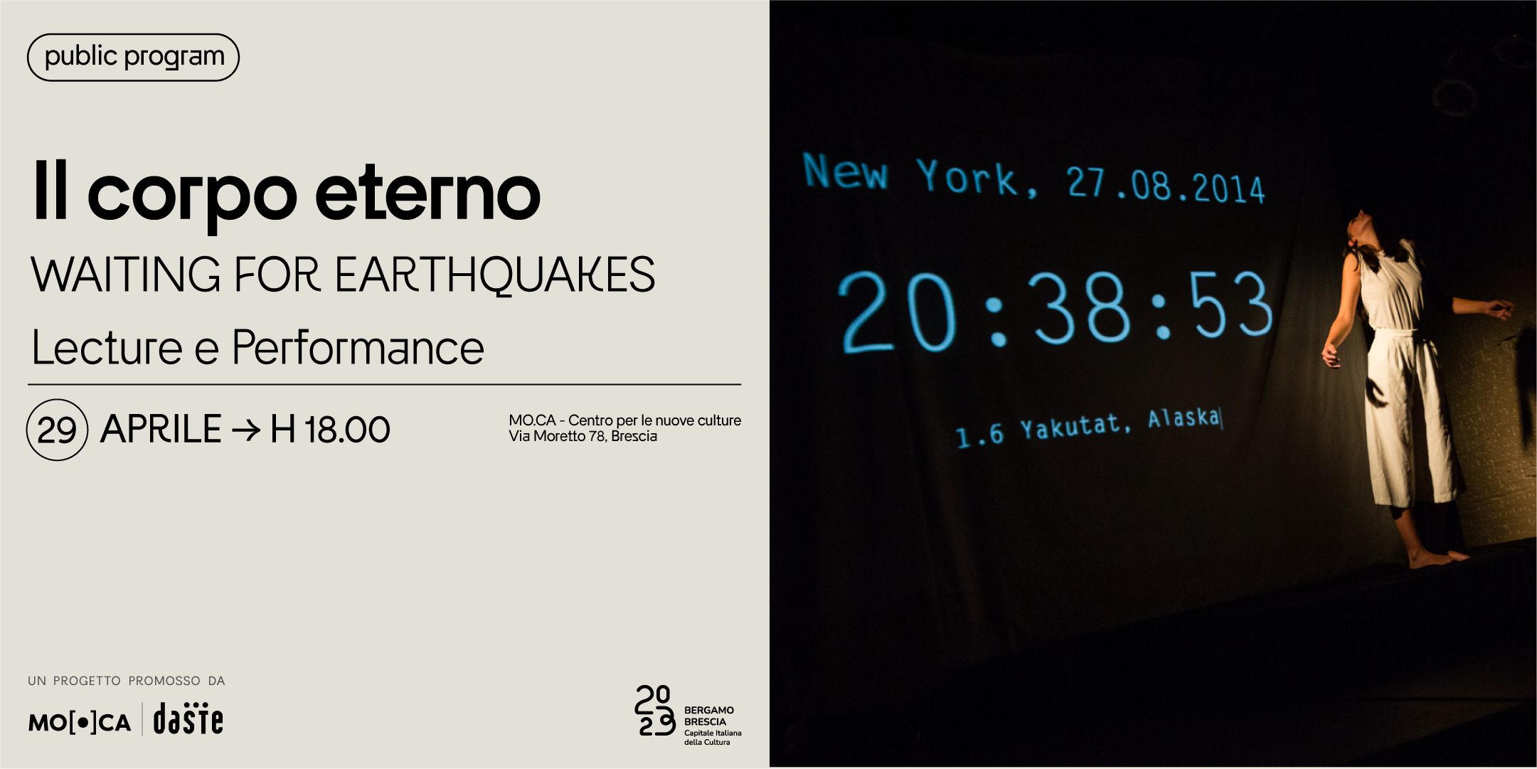 Moon Ribas, cyborg artista e coreografa, co-fondatrice di Cyborg Foundation nel 2010 e Trans Species Society nel 2017 insieme a Neil Harbisson, indaga quali sono le possibilità di coesistenza fra corpo umano, tecnologia e corpo animale, e che tipo di nuove sensorialità biologiche (sia umane che non) la tecnologia va delineando. A Brescia presenterà il suo Seismic Sense, un sensore sismico online che le permette di percepire in tempo reale i terremoti che avvengono in qualsiasi punto del pianeta e i moonquakes, l’attività sismica sulla Luna. Ribas ritiene che, estendendo i nostri sensi per percepire al di fuori del pianeta, possiamo diventare tutti sens-tronauti. Nella performance Waiting For Earthquakes, l’artista traspone i terremoti in danza, interpretando le coreografie della terra, accompagnata dalla colonna sonora composta da Quim Girón utilizzando i dati dei terremoti in tempo reale