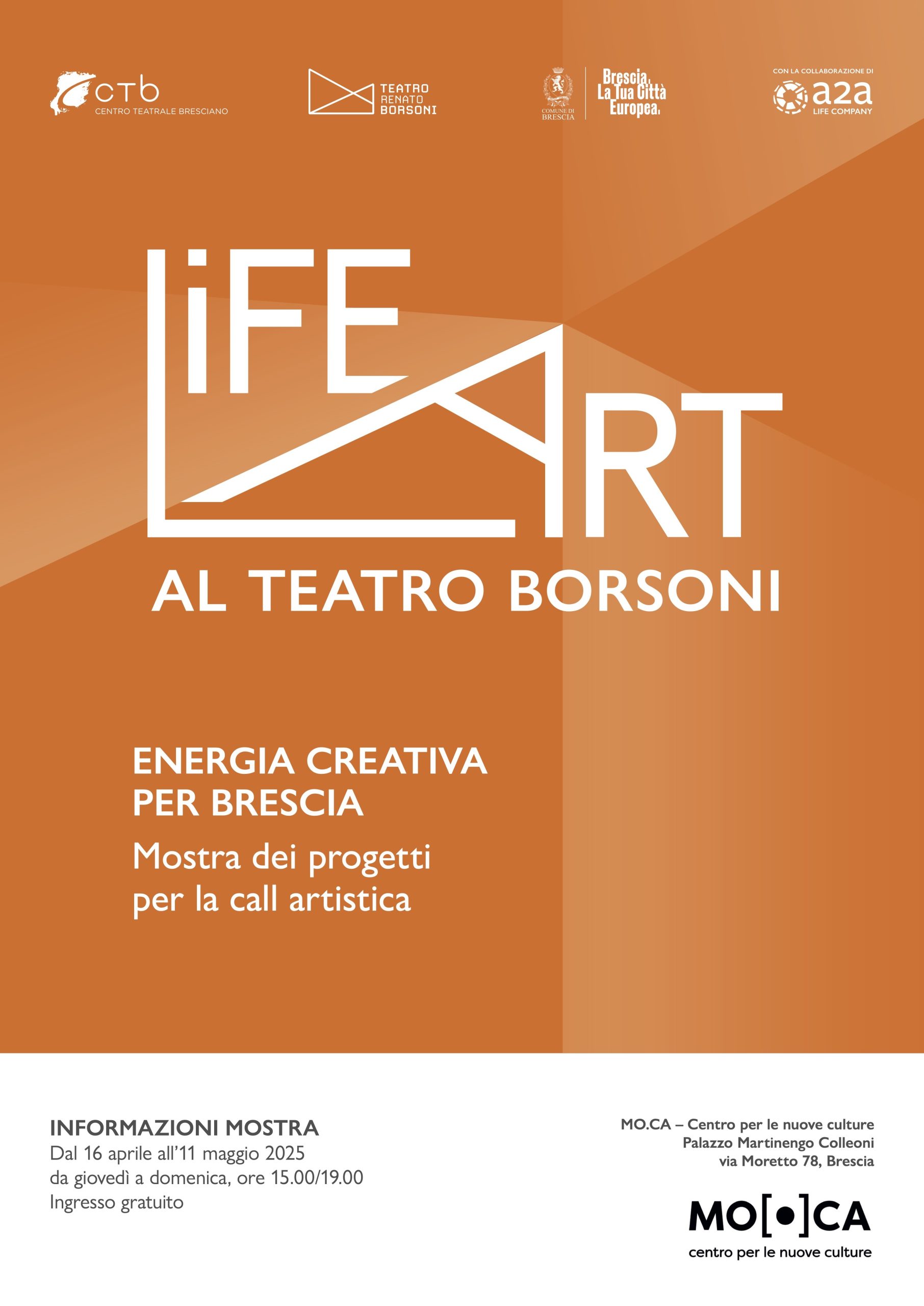 La mostra intende presentare al pubblico una selezione, operata dalla Commissione giudicatrice, di progetti ideati da ventisette artisti che hanno partecipato alla call artistica LIFE ART al Teatro Borsoni, indetta da CTB – Centro Teatrale Bresciano, in collaborazione con COMUNE DI BRESCIA e A2A S.p.A. e a cura di Valentina Ciarallo, per la progettazione, la realizzazione e l’installazione di un’opera d’arte permanente per gli spazi esterni del Teatro Borsoni a Brescia.