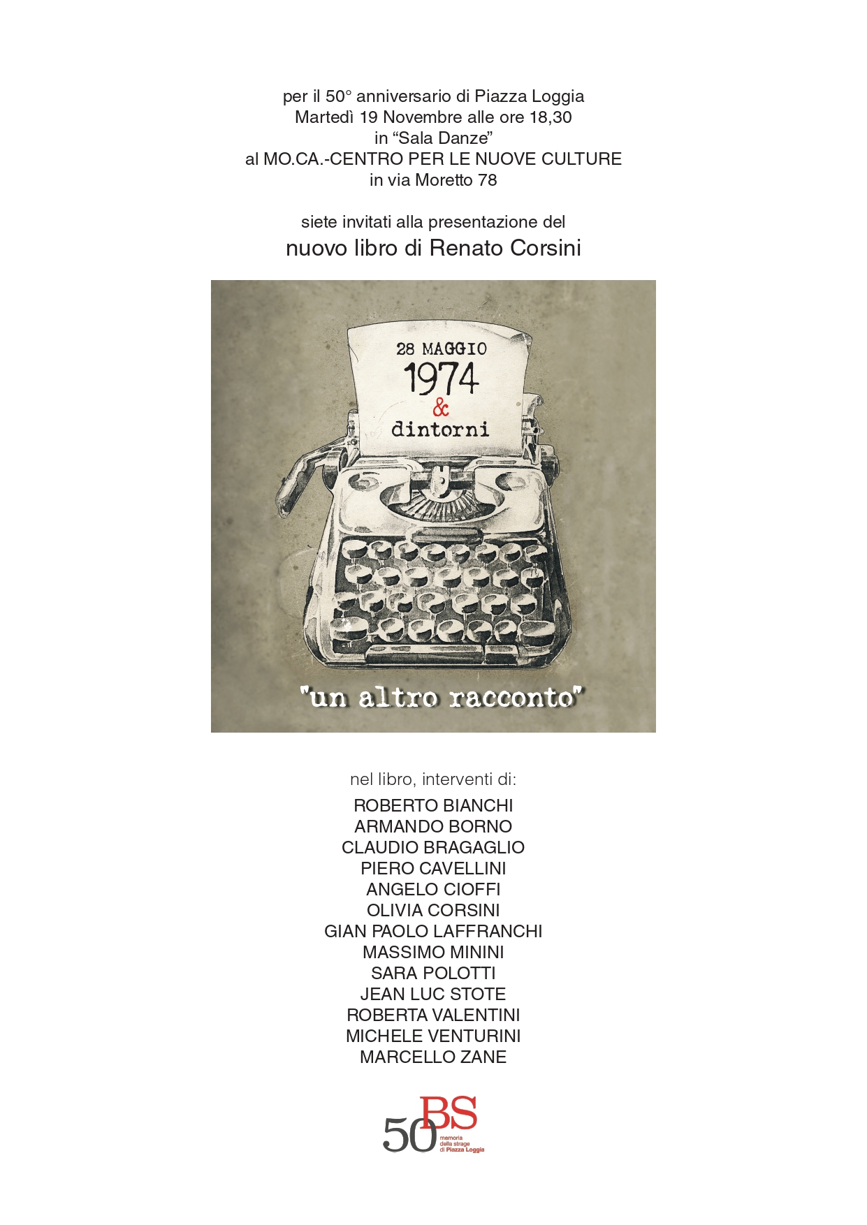 Per il 50° anniversario di Piazza Loggia presentazione libro – 28 MAGGIO 1974 & dintorni, “un altro racconto” – un libro di Renato Corsini