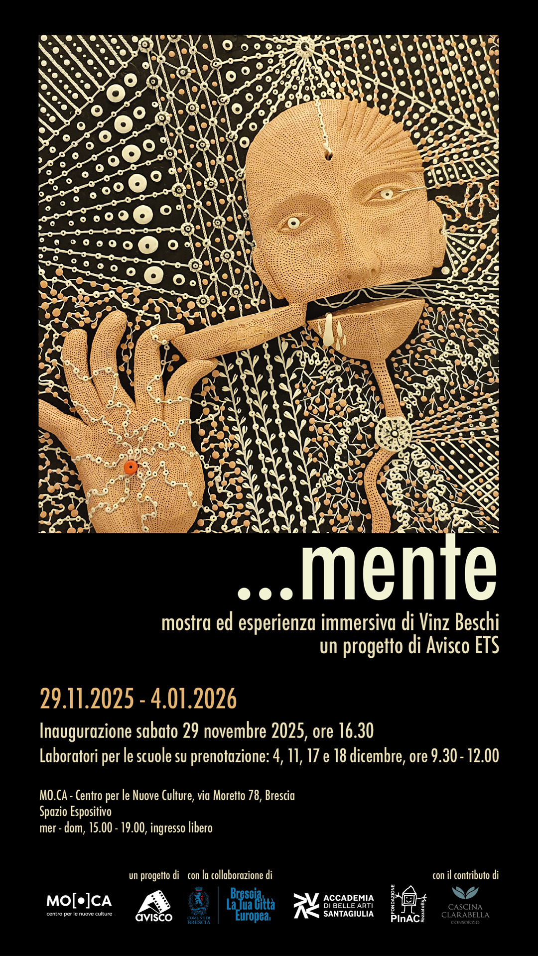 “… mente”, progetto espositivo e immersivo di Vinz Beschi, artista e regista bresciano selezionato attraverso la Call for Artists indetta dal Comune di Brescia. Per Beschi, fondatore nel 1986 di AVISCO ETS, di cui è oggi direttore artistico, si tratta della prima esposizione personale nella città natale dopo una lunga attività presentata in Italia e all’estero.