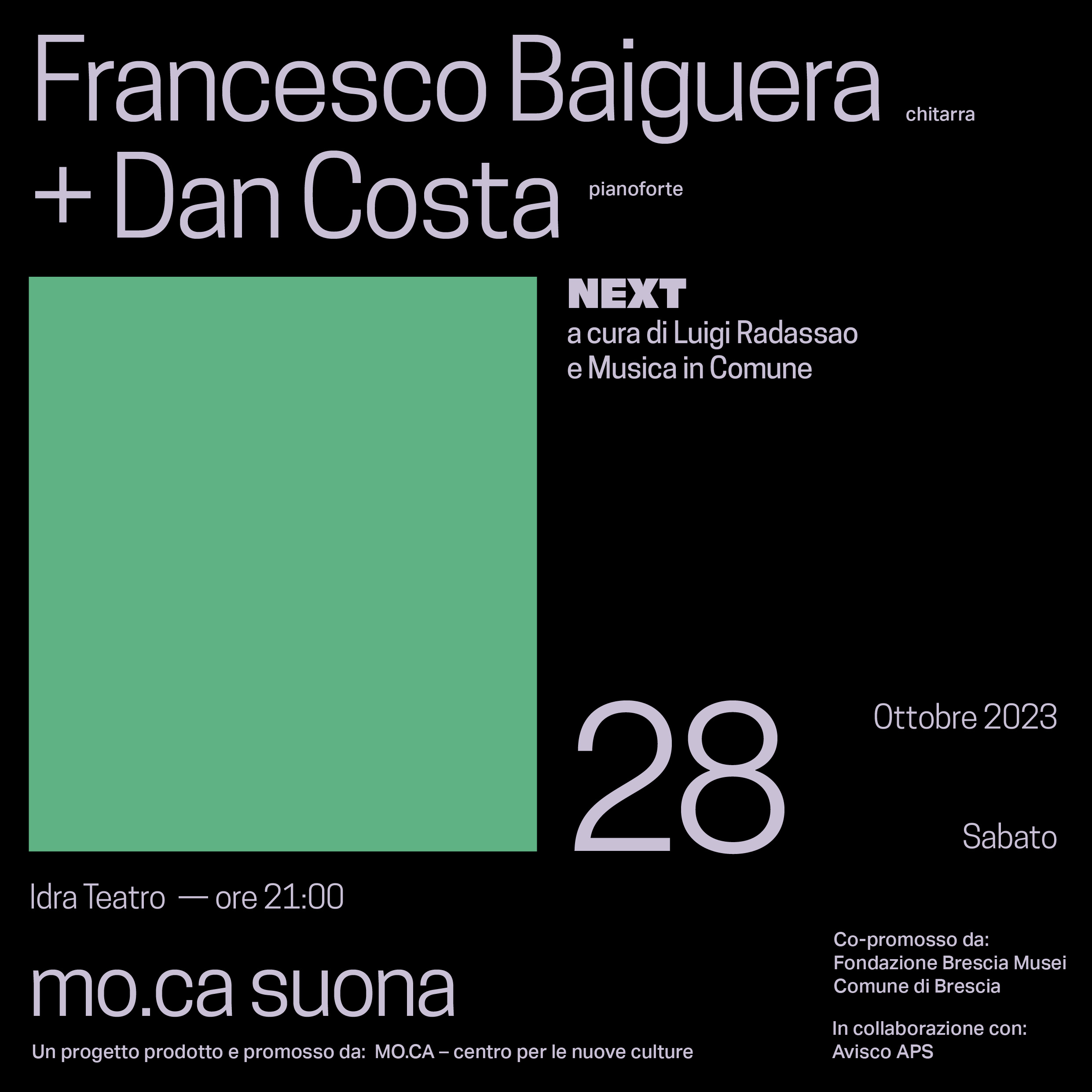 Il duo festeggia il rinnovato incontro tra il pianista londinese Dan Costa e il chitarrista bresciano Francesco Baiguera. In un dialogo sempre nuovo e creativo, i due musicisti collaborano da diversi anni alla ricerca di una personale interpretazione stilistica di un repertorio che guarda alla tradizione mainstream, ma si apre anche verso colori di derivazione sudamericana (e non solo), in un susseguirsi di molteplici atmosfere dove delicatezza e ritmo trovano un fine equilibrio.
