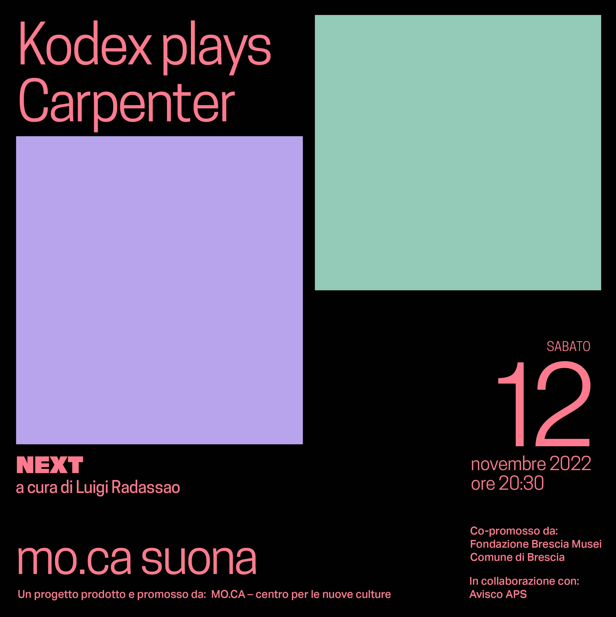 Un concerto elettro-acustico in cui il trio Kodex (Donatello D’Attoma, Massimo Bonucelli e Simone Memè) rende omaggio al regista americano John Carpenter proponendo una performance di musica e video. La band ripropone e ri-arrangia alcune delle colonne sonore e delle scene dei suoi film più iconici, da “Grosso Guaio a Chinatown” a “Fuga da New York”, tra fedeli riletture e improvvisazione estrema.