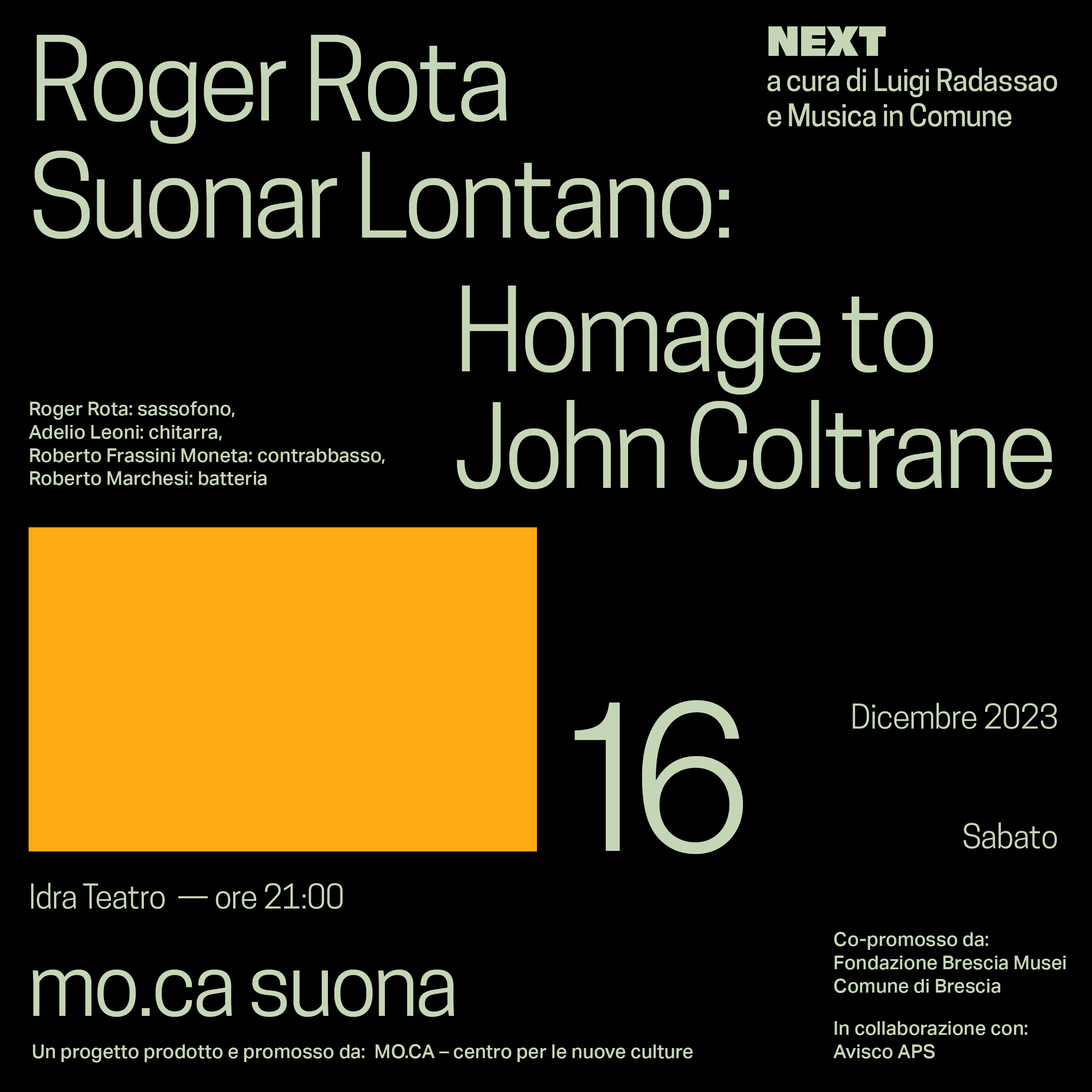 Il progetto del sassofonista e compositore bergamasco Roger Rota si ispira all’esperienza spirituale e mistica di John Coltrane ed è un omaggio alla sua straordinaria forza d’animo, all’originalità, all’audacia e alla sua totale devozione alla musica. Dedicato al sommo musicista, improvvisatore, compositore e ricercatore instancabile, padre della New thing e del Free Jazz.