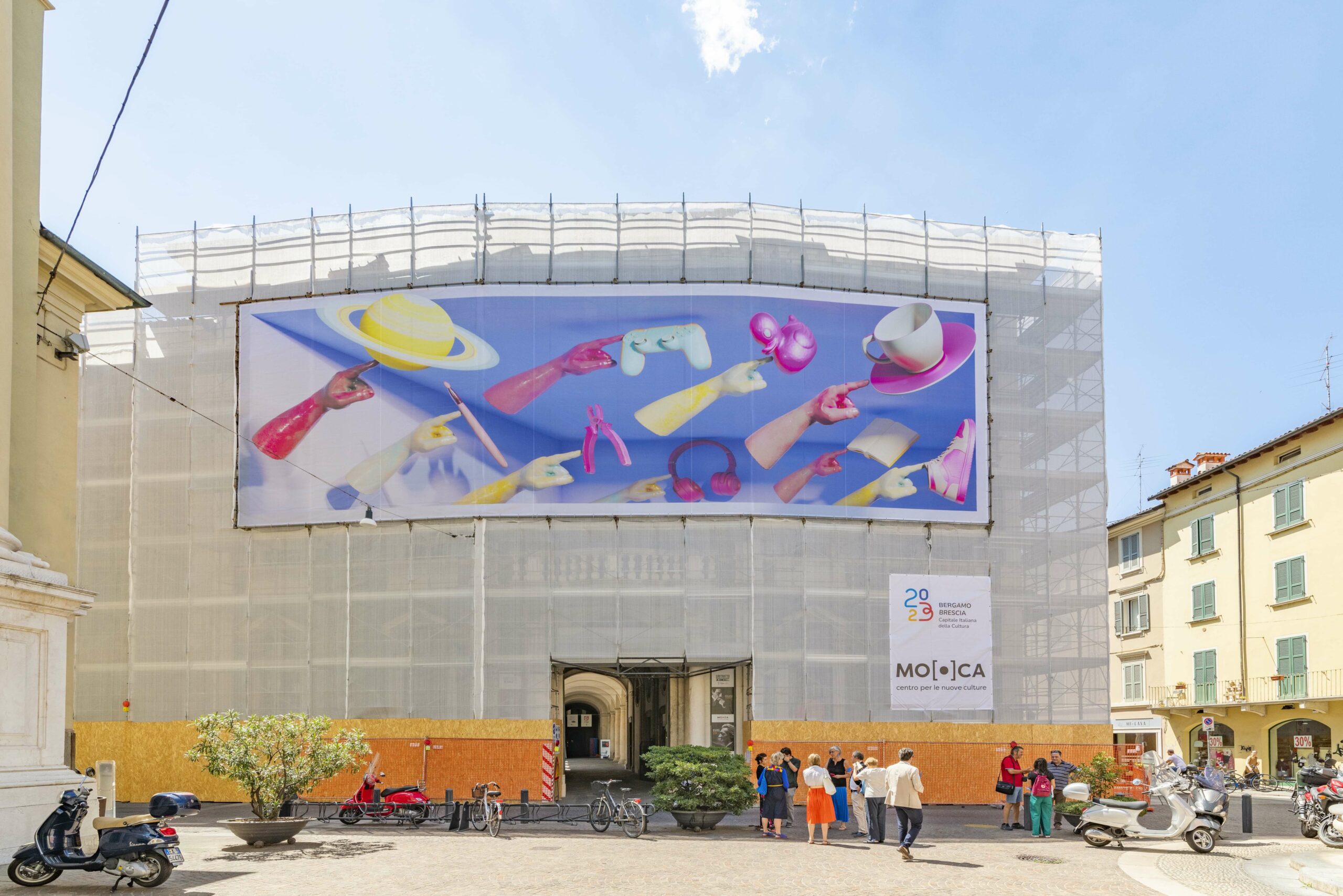 L’immagine 3D sulla facciata del palazzo presenta delle mani che sono intente a spostare in avanti una serie di oggetti: un libro, una tazzina, un gadget elettronico, una scarpa, una pinza e un pianeta. Le mani, spesso gesticolanti, sono di frequente protagoniste delle narrazioni sul progresso, ma sono anche cariche di significati molteplici. Tra questi c’è l’evocazione della tradizione iconografica sulla buona ventura, sia religiosa che non: dal dito dell’incredulo San Tommaso di Caravaggio che verifica la realtà di ciò che vede, a quello che indica una connessione tra sfere diverse come quello nel Giudizio Universale di Michelangelo, e paradossalmente, quello del chiromante che legge i palmi di chi vuole conoscere il futuro. Tali simbologie e linguaggi sono però oggi riappropriati principalmente dalla Silicon Valley e dall’industria di massa per promuovere nuovi futuri utopici — basti pensare al cursore a forma di indice nell’interfaccia grafica del desktop che usiamo tutti i giorni.