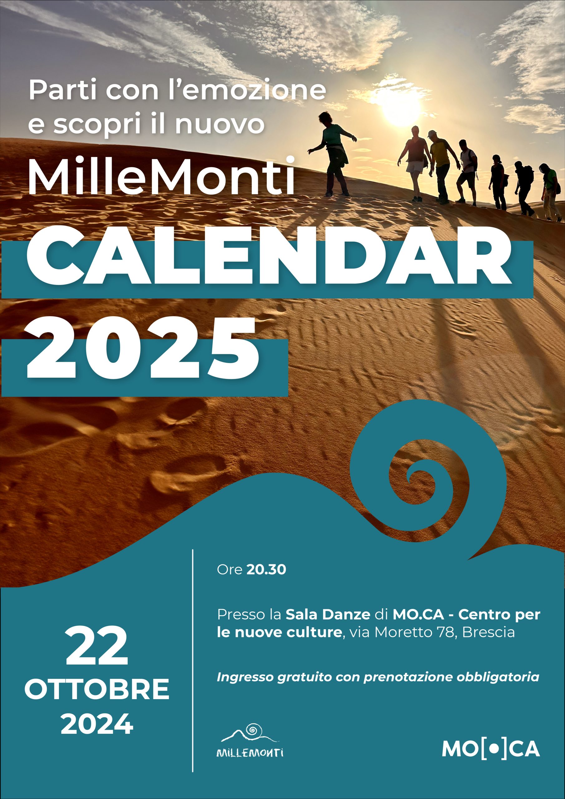 Location di prestigio e nuove sorprendenti destinazioni: il 22 ottobre 2024 parte l’emozione dei prossimi viaggi. È famosa come un incubatore di progetti innovativi, come spazio di aggregazione, come luogo dove la cultura trova casa: è il Moca, si trova nel cuore di Brescia. L’abbiamo scelta con entusiasmo per presentare e brindare al nuovo Calendario 2025 di MilleMonti. Sarà uno spettacolo di immagini, un’immersione verso mete da sogno attraverso le descrizioni di Andrea e Cristian. Sarà impossibile resistere all’emozione e al piacere di una serata in cui le meraviglie del mondo saranno protagoniste!