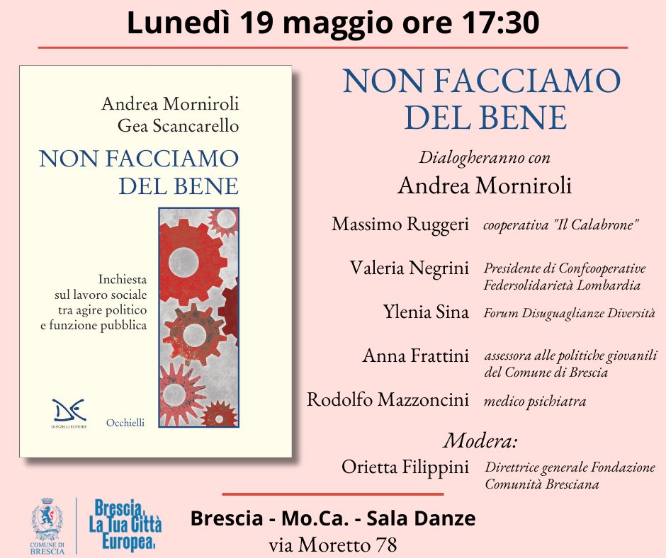 Alla presentazione del libro di Andrea Morniroli e Gea Scancarello, “Non facciamo del bene. Inchiesta sul lavoro sociale tra agire politico e funzione pubblica”, dialogheranno con Andrea Morniroli: Valeria Negrini, presidente di Confcooperative Federsolidarietà Lombardia, Ylenia Sina, Forum Diseguaglianze e Diversità, Anna Frattini, assessora alle politiche giovanili del Comune di Brescia e Rodolfo Mazzoncini, medico psichiatra. Modera gli interventi Orietta Filippini, Direttrice generale della FCB.