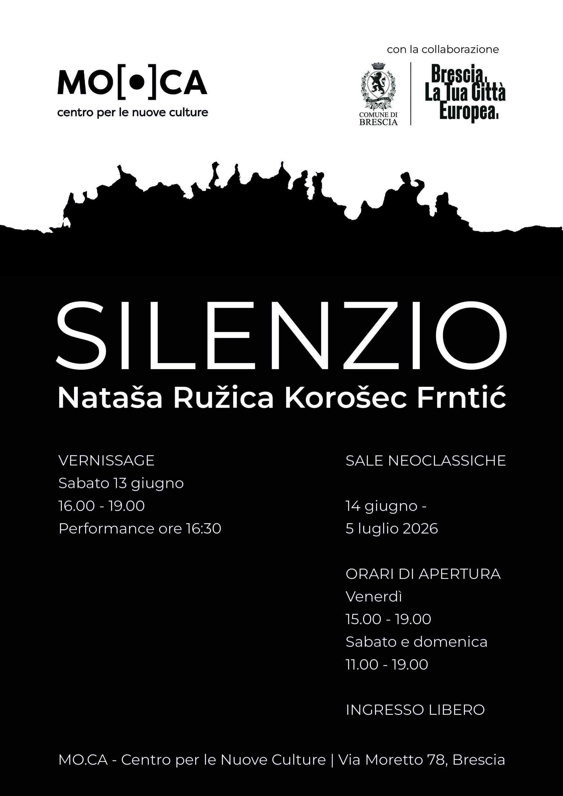 La mostra Silenzio si svolge nelle prestigiose Sale Neoclassiche del MO.CA – Centro per le Nuove Culture, spazi storici e architettonicamente ricchi che dialogano con il contemporaneo, trasformando il palazzo in un luogo di esperienza sensoriale e riflessione critica.