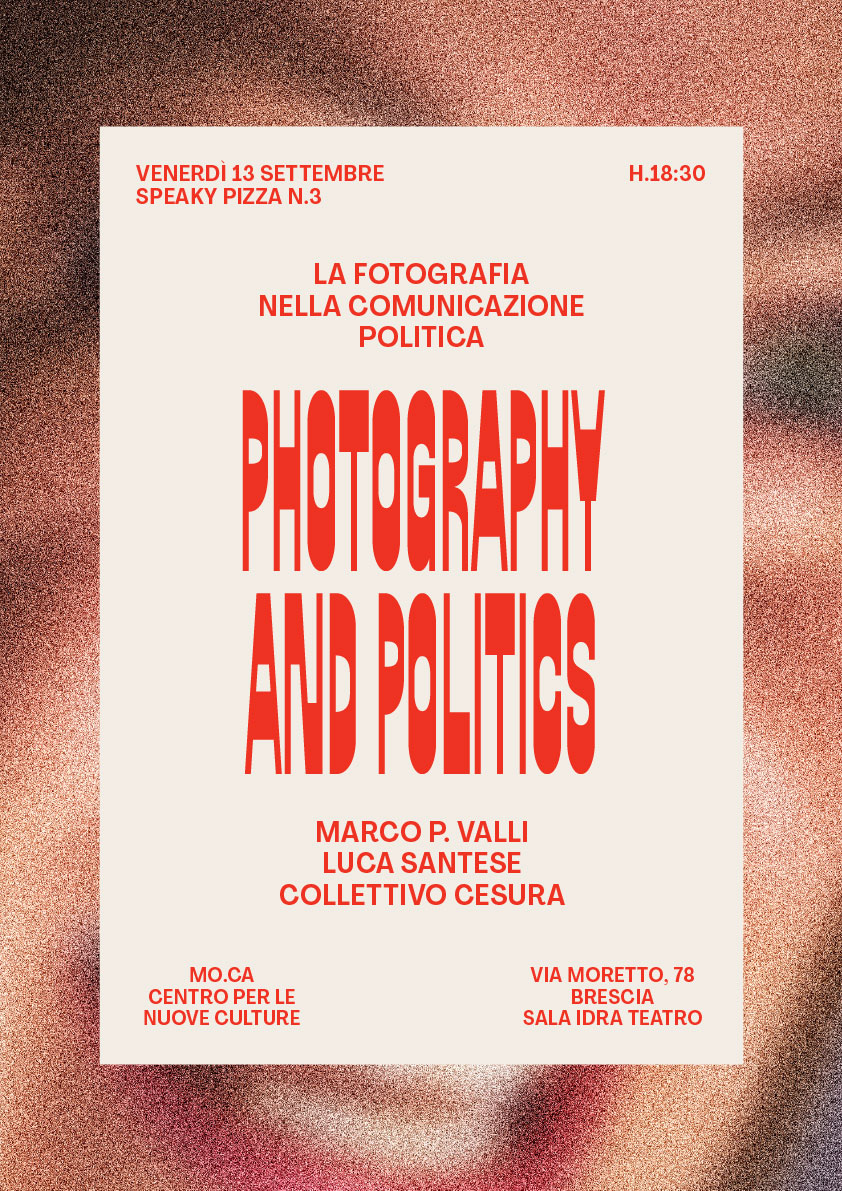 Ospiti: Luca Santese e Marco P. Valli, fotografi del collettivo Cesura e attivi nell’ultimo decennio nel panorama della fotografia contemporanea, sono co-autori di Realpolitik: progetto fotografico di critica e riflessione satirica sull’iconografia di propaganda e comunicazione politica italiana contemporanea. Il lavoro si compone di una serie di pubblicazioni indipendenti e una mostra, ed è stato pubblicato sui principali magazine nazionali ed internazionali.