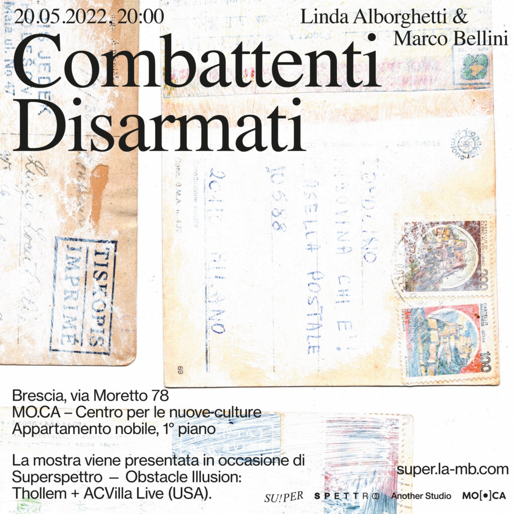 Il duo di artisti attivo dal 2014 torna a sperimentare e condividere la propria visione proponendo Combattenti disarmati. I lavori in mostra parlano non di un luogo perso, non un altrove, ma spazio concreto di faccende. Nella trama di sogni e di vicende, una mappa diversa e parallela. La mostra viene presentata in occasione di Superspettro — Obstacle Illusion by Thollem + ACVilla Live (USA).