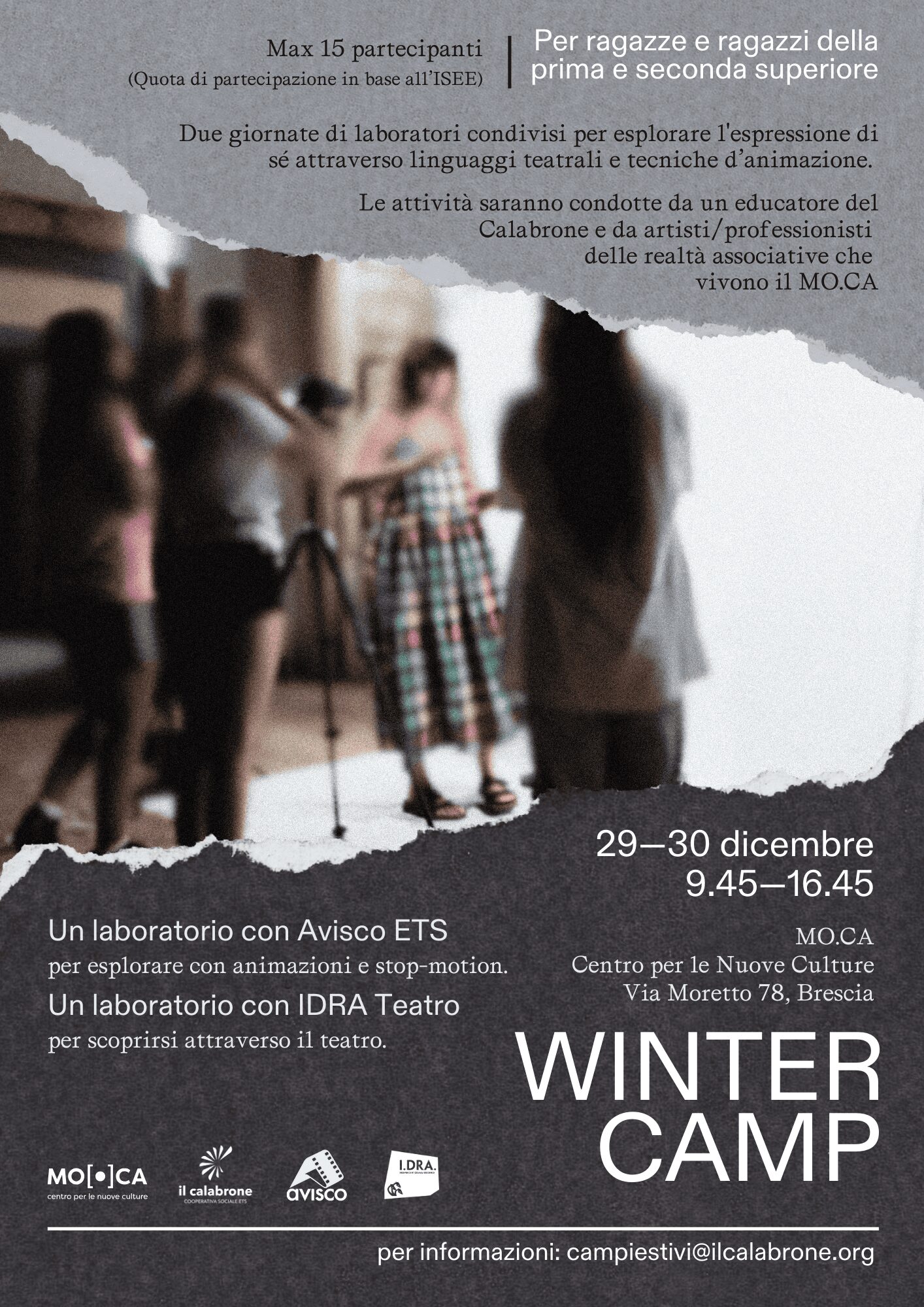 Il Winter Camp MO.CA è un’esperienza creativa di due giornate pensata per ragazze e ragazzi di prima e seconda superiore che vogliono esplorare l’espressione di sé attraverso linguaggi artistici contemporanei: teatro e animazione in stop motion.