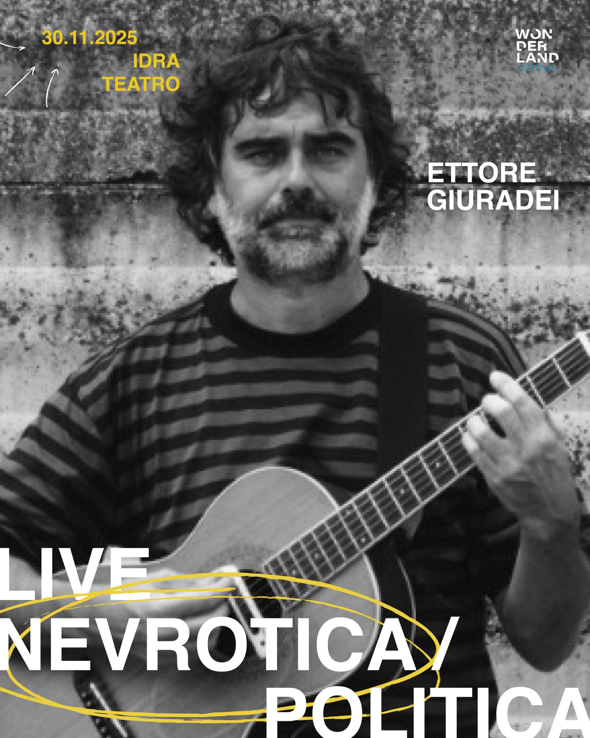 Ettore Giuradei, attore/cantautore bresciano, classe 1981. Artista poliedrico, ha pubblicato numerosi dischi a partire dal 2006: Panciastorie (2006, Mizar Records), Era che così (2008, Mizar/Novunque), La repubblica del sole (2010, Mizar/Novunque) e Lucertola (2019, Freecom/UMArecords/Casa Molloy). Nel 2013 ufficializza la collaborazione con il fratello Marco Giuradei creando il progetto Giuradei, col quale pubblica un disco self-titled per Picicca Dischi, mentre nel 2018 entra a far parte della band DUNK, insieme a Luca Ferrari (Verdena) alla batteria, Carmelo Pipitone (O.R.K./Marta sui Tubi) alle chitarre e Marco Giuradei al pianoforte, synth e cori. Insieme pubblicano un omonimo disco nello stesso anno (Woodworm Label). Nell’ottobre 2022 avvia una campagna di crowdfunding per finanziare la realizzazione del nuovo album, Nevrotica/Politica, in uscita il 19 maggio 2023 per Freecom. Il disco parte dall’esigenza di creare un lavoro “di musica d’insieme, suonato, con un tempo di gestazione lungo, fatto di ascolto e di confronto”, alla ricerca di “altre forme di vita”. Hanno collaborato alla realizzazione Vincenzo Albini (violino), Fidel Fogaroli (tastiere), Giacomo Papetti (basso) e Filippo Sala (batteria), con la sapiente direzione artistica di Marco Parente.