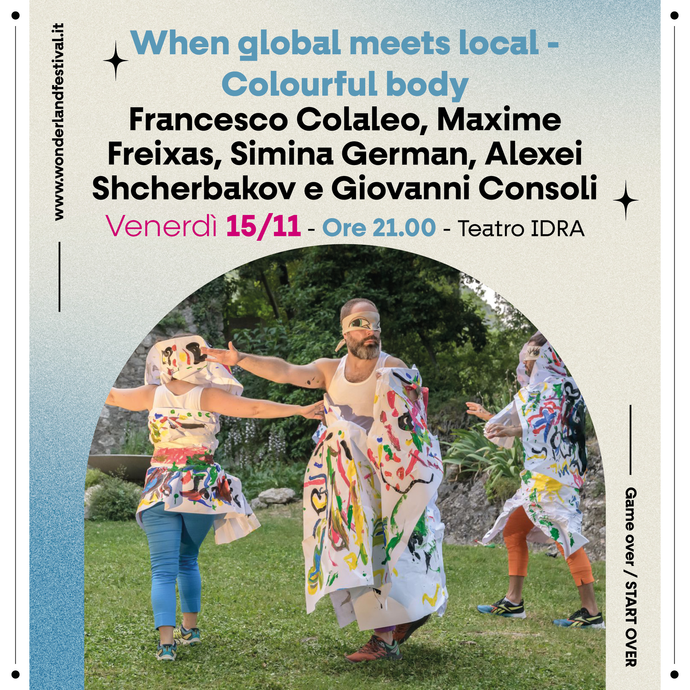 Il progetto internazionale When global meets local è un incontro orientato al processo tra gli artisti e le artiste internazionali Francesco Colaleo, Maxime Freixas, Lex Shcherbakov e Simina German. Provenienti da discipline diverse – Francesco e Maxime dalla danza, Simina e Lex dal teatro – si sono incontrati per la prima parte del progetto a Ulm, in Germania, e hanno iniziato una collaborazione che non mira a un prodotto finale o a uno spettacolo ma allo scambio reciproco e alla sperimentazione. Si tratta di ascoltarsi a vicenda e di creare insieme in modo libero. Il gruppo ha continuato la sua ricerca nelle residenze a Pomarance e ad Arsoli in Italia. In un formato aperto condividono parti del loro processo con il pubblico e rendendolo trasparente e giocoso. A Wonderland 2024 si unirà al gruppo di performer l’artista bresciano Giovanni Consoli