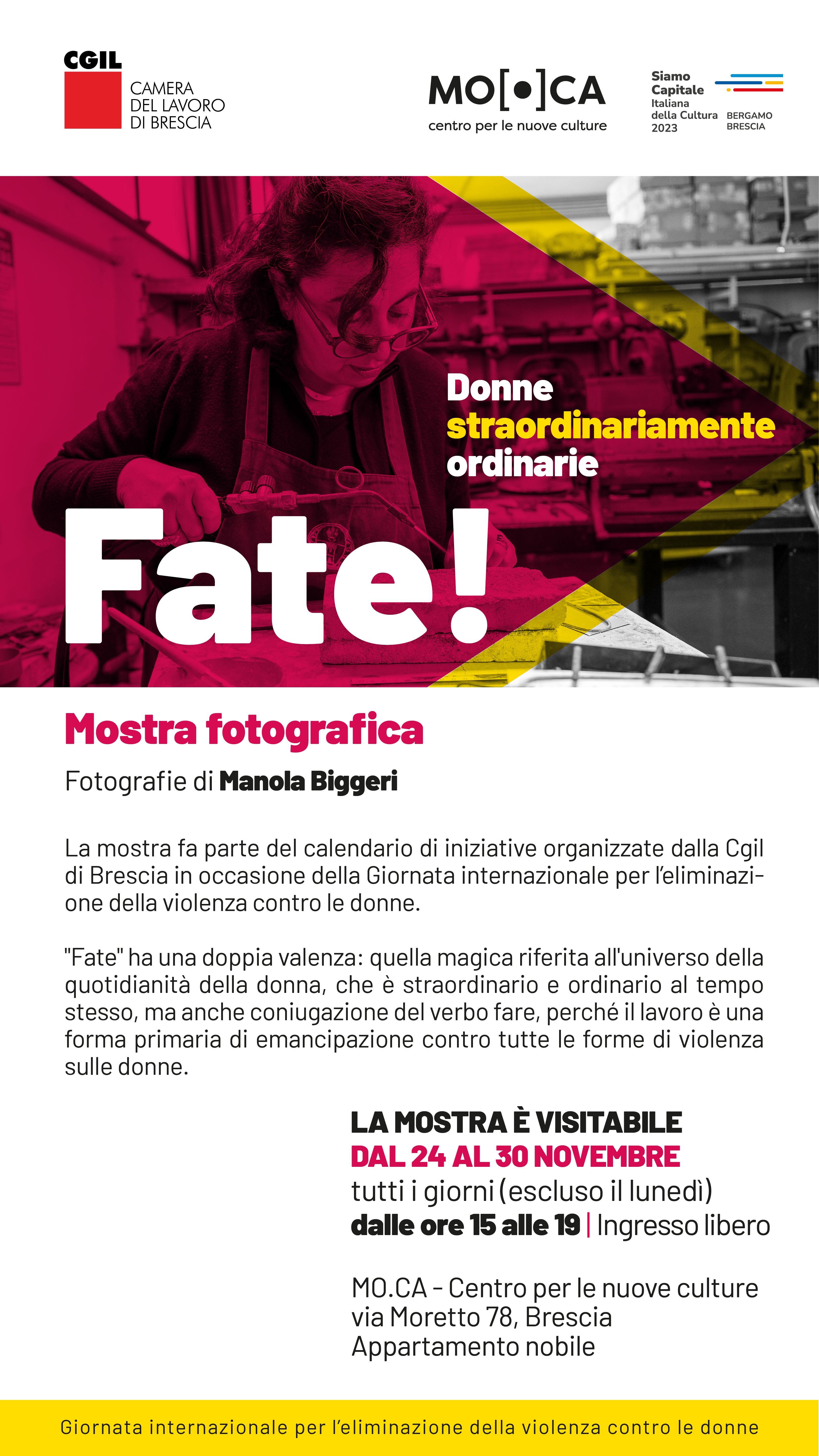 Due “falegname”, un’artigiana della bellezza”, “una tessitrice di sogni”, una “carrista”, un’ingegnera di sostegno”. Sono alcune delle donne protagoniste della mostra fotografica “Fate. Donne straordinariamente ordinarie” firmata da Manola Biggeri (delegata Fisac Cgil Firenze) e organizzata dalla Cgil di Brescia in occasione della Giornata internazionale per l’eliminazione della violenza contro le donne.