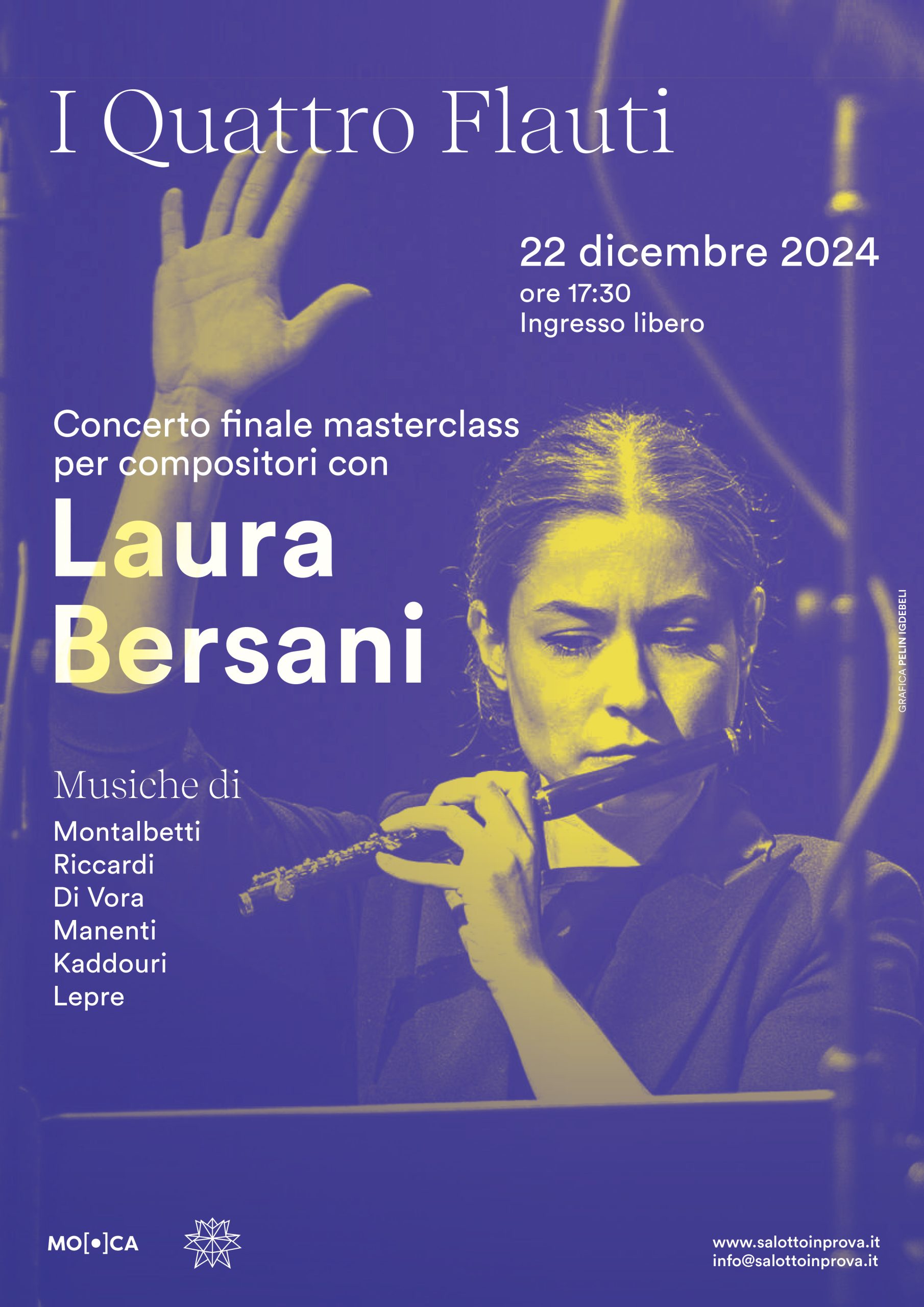 Con il concerto finale di dicembre si completa il percorso della Masterclass condotta da Laura Bersani, su i flauti nella musica contemporanea. Verranno presentati i lavori, in prima assoluta, dei giovani compositori che hanno partecipato al corso. A impreziosire il programma il brano “Foglie” (2002) per flauto solo di Mauro Montalbetti.